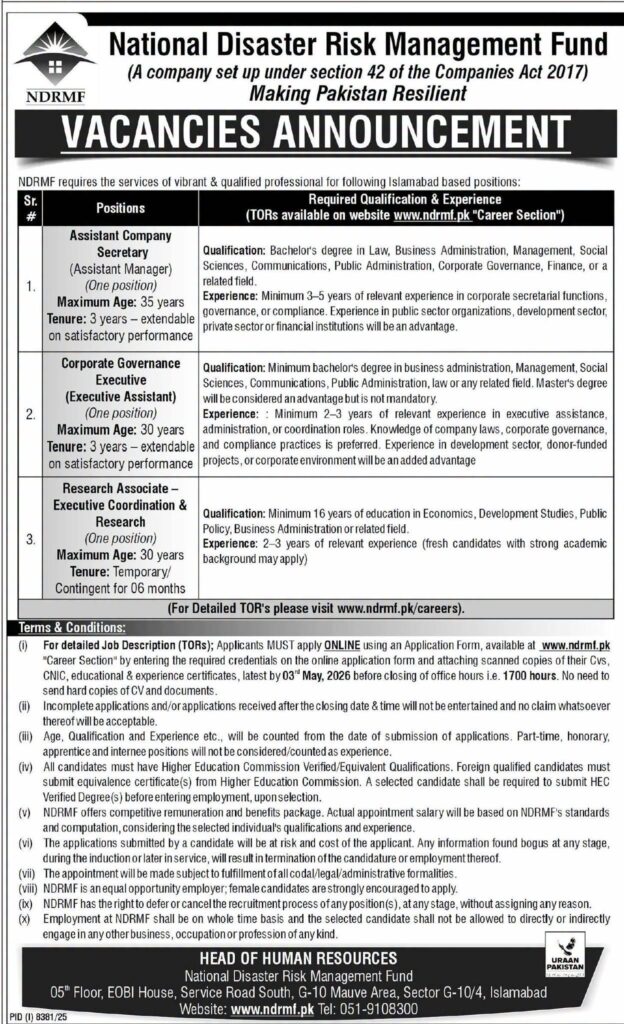 Apply for NDRMF Jobs 2026 in Islamabad. Explore assistant company secretary, corporate governance executive, and research associate roles with eligibility, experience, deadline, and application details.