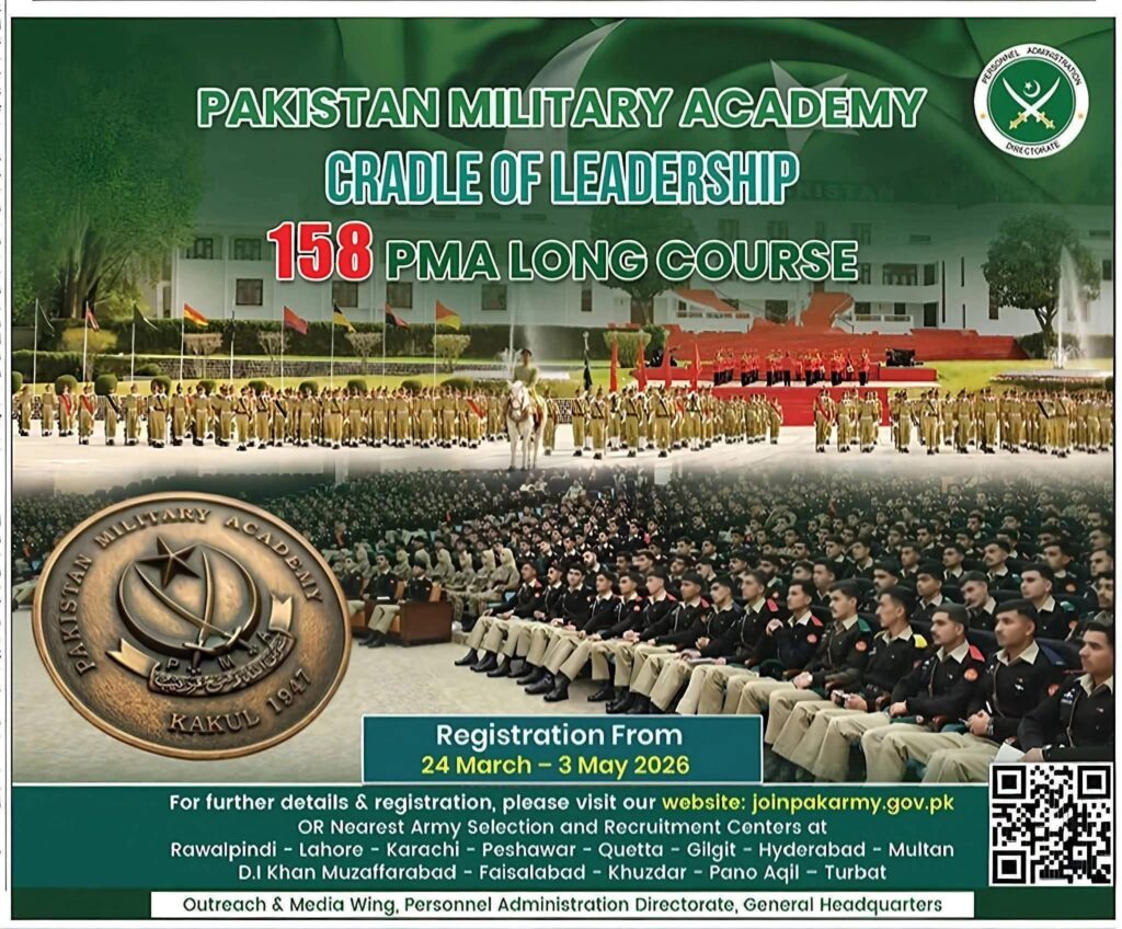 Looking to join the Pakistan Army? Registration for the 158 PMA Long Course 2026 is now open. Find eligibility criteria, registration dates, and selection center details for the Pakistan Military Academy (PMA) Kakul. Apply before May 3, 2026.