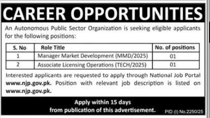 “Explore career opportunities with a public sector organization for Manager Market Development and Associate Licensing Operations positions. Apply within 15 days through National Job Portal at www.njp.gov.pk.”