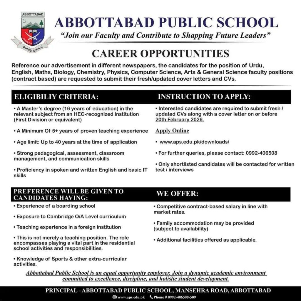 Apply for Abbottabad Public School Faculty Jobs 2026 on contract basis. Teaching vacancies in Urdu, English, Maths, Biology, Chemistry, Physics, Computer Science and Arts. Check eligibility, age limit and deadline.