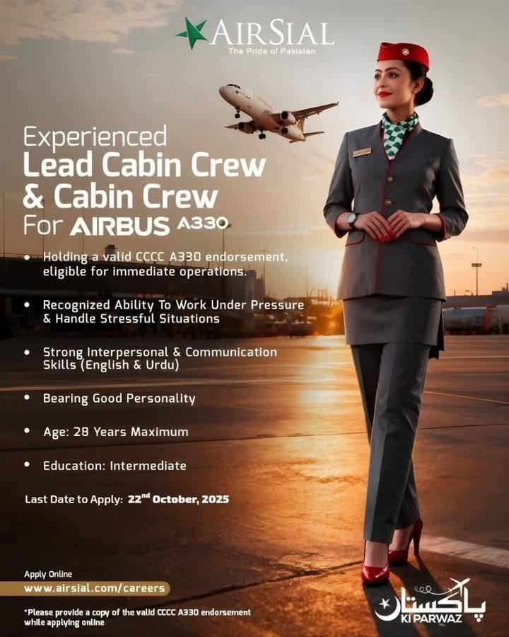 “AirSial is hiring experienced Lead Cabin Crew and Cabin Crew for Airbus A330 operations. Apply now if you hold a valid CCCC A330 endorsement, have excellent communication skills, and can handle stressful situations. Submit your application by October 22, 2025.”