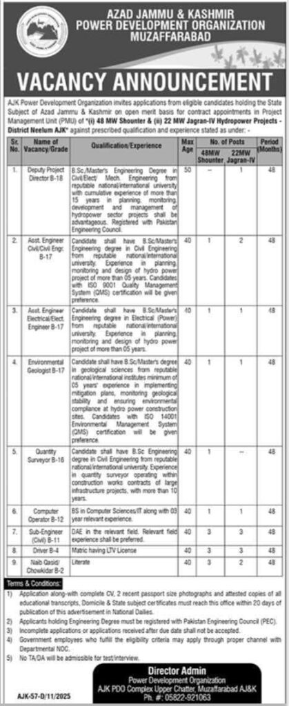 Apply for AJK PDO Jobs 2025 in the Power Development Organization Muzaffarabad. Positions open for Deputy Project Director, Engineers, Geologist, Quantity Surveyor, Computer Operator, Sub Engineer, Driver, and Naib Qasid for PMU of 48MW Shounter & 22MW Jagran-IV Hydropower Projects. Check qualifications, age limits, and application process.