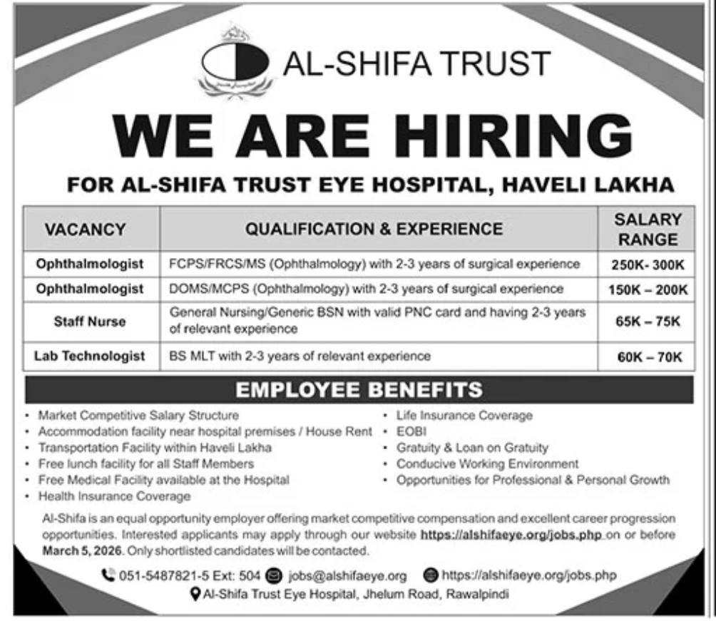Join Al-Shifa Trust Eye Hospital in Haveli Lakha. Available positions include Ophthalmologists, Staff Nurses, and Lab Technologists with competitive salaries ranging from 60K to 300K. Learn more about the job qualifications, experience requirements, and benefits. Apply by March 5, 2026.