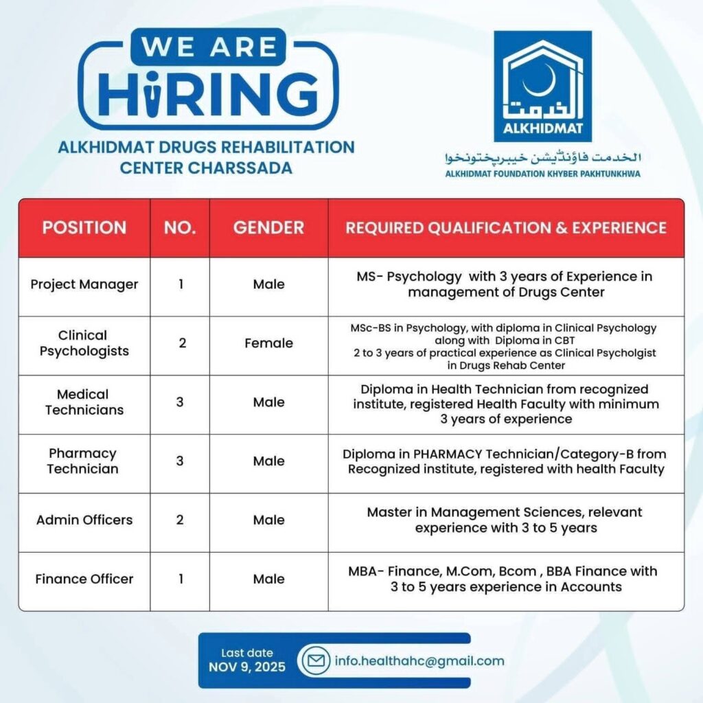 Looking for rehabilitation center jobs in Charsadda? Alkhidmat Drugs Rehabilitation Center is hiring qualified professionals including Clinical Psychologists, Medical Technicians, and Admin Officers. Apply now before November 9, 2025.