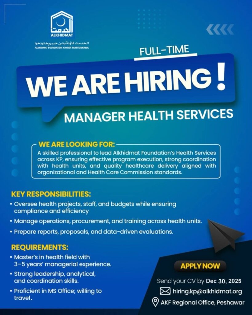 Latest Alkhidmat Foundation KP Jobs 2026 for Manager Health Services. Apply for full-time healthcare management vacancy in Peshawar with competitive requirements and professional growth opportunities.