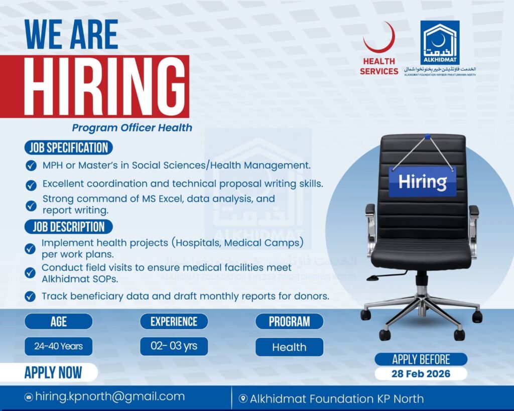 Apply for Program Officer Health job at Alkhidmat Foundation KP North. Requires MPH or Master’s in Social Sciences, 2–3 years of experience. Competitive salary. Apply by 28th February 2026.