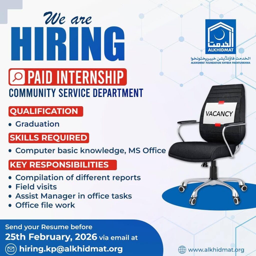 Apply for Alkhidmat Foundation Khyber Pakhtunkhwa Paid Internship 2026 in the Community Service Department. Graduation required. Check eligibility, skills, responsibilities, and application deadline 25 February 2026.