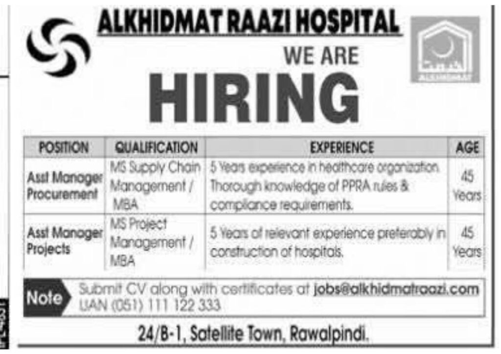 Looking for qualified Assistant Managers at Alkhidmat Raazi Hospital, Rawalpindi. Positions available in Procurement and Projects. Candidates with 5 years of relevant experience in healthcare and project management are encouraged to apply. Competitive salary and benefits. Apply now for these rewarding opportunities!