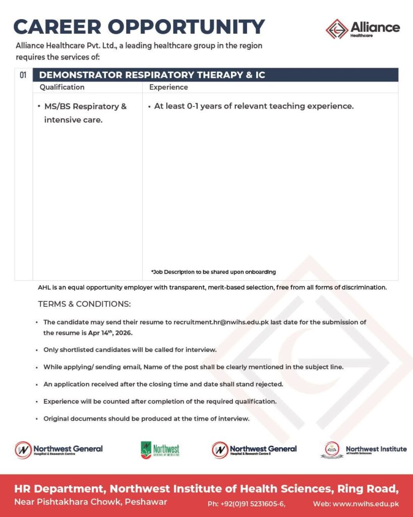 Apply for Alliance Healthcare Respiratory Therapy Demonstrator job 2026 in Peshawar. Fresh MS/BS graduates can apply. Deadline April 14, 2026. Check eligibility, requirements, and application process.