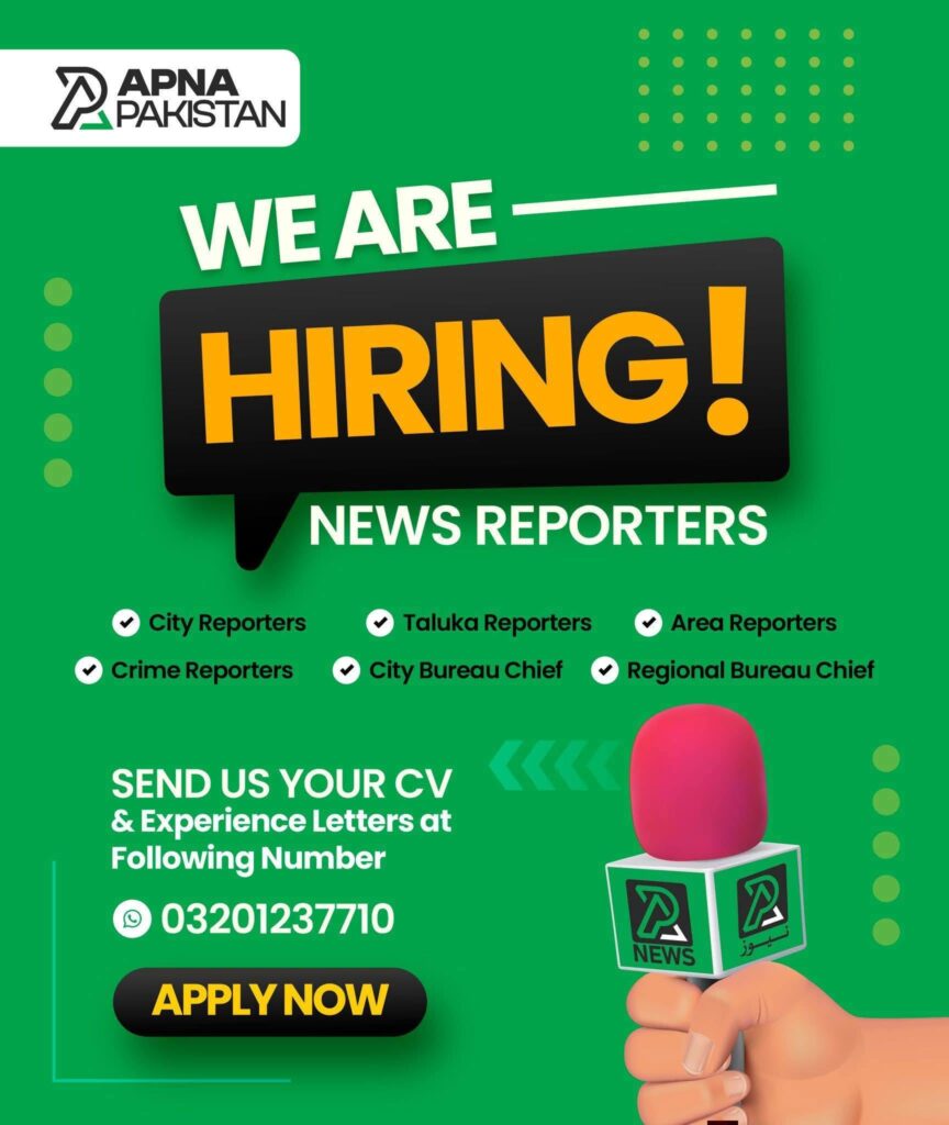 Join Apna Pakistan as a News Reporter or Bureau Chief. Multiple roles available for City, Crime, and Area Reporters. Send your CV and experience letters via WhatsApp.