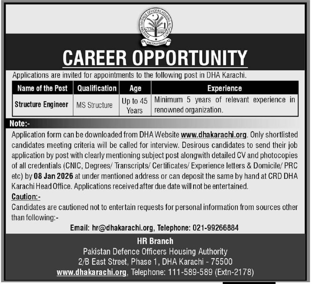 “Explore career opportunities with DHA Karachi. Apply for the position of Structural Engineer if you meet the required qualifications and experience. Visit the DHA Karachi website for more details.”
