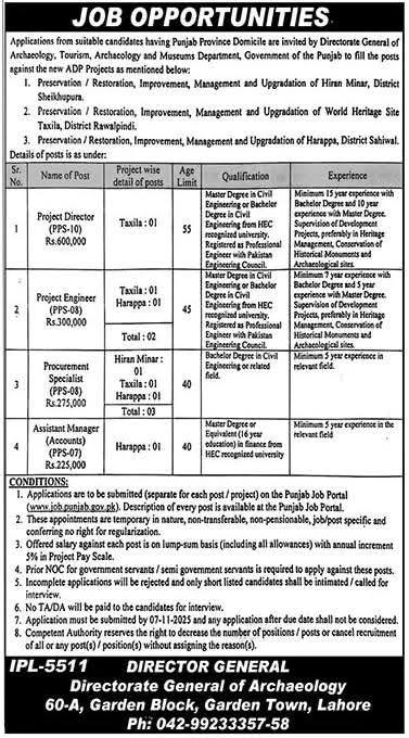 “Directorate General of Archaeology, Punjab is hiring for multiple positions including Project Director, Project Engineer, Procurement Specialist, and Assistant Manager in archaeological preservation projects. Apply now for these government roles. Last date: 7th November 2025.”