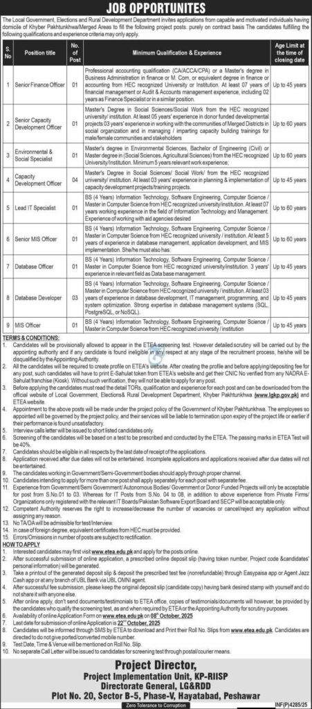 Explore various government job openings at the Local Government, Elections, and Rural Development Department, Khyber Pakhtunkhwa. Positions available for Senior Finance Officer, Social Specialists, and IT roles. Apply by October 22, 2025.