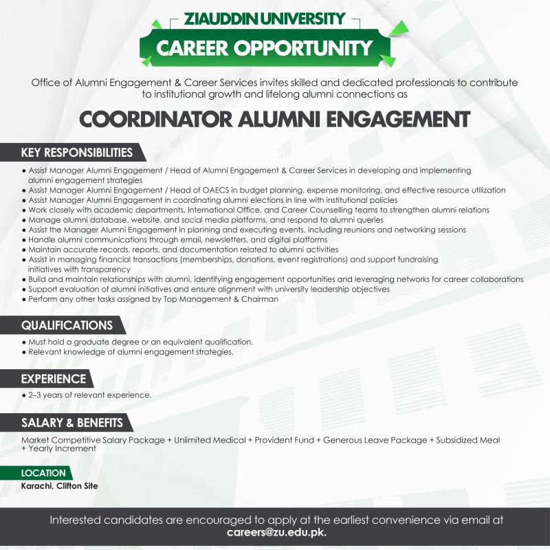Apply for Coordinator Alumni Engagement job 2026 at Ziauddin University Karachi. Graduate degree with 2–3 years experience required. Competitive salary and benefits.