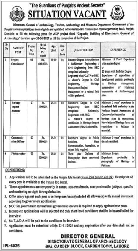 Directorate General of Archaeology, Lahore, invites applications for the ADP project “Capacity Building” on a lump-sum basis. Vacancies include Project Coordinator, Heritage Impact Assessor, Communication Officer, and Photographer. Requires Master’s/Bachelor’s in Archaeology/Architecture/Public Relations with relevant experience. Apply via Punjab Job Portal by 23-11-2025.