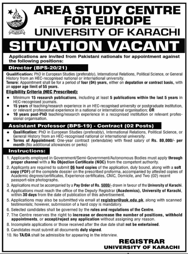 Apply for Area Study Centre for Europe, University of Karachi Jobs 2026. Vacancies for Director (BPS-20/21) and Assistant Professor (BPS-19). Check eligibility, qualifications, experience, and application process.