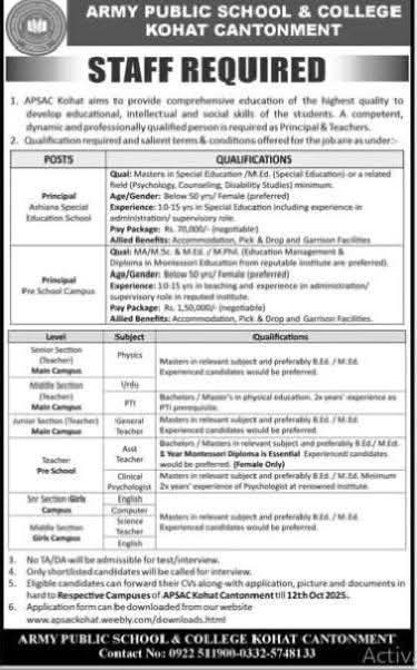 “Army Public School & College, Kohat Cantonment, is hiring for multiple faculty and administrative positions, including Principal, Teacher, and Staff. Apply by 12th October 2025 for a chance to join a dynamic educational institution.”