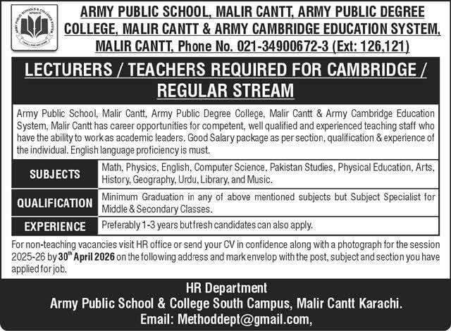 Apply for Army Public School Malir Cantt Jobs 2026 in Karachi. Teaching and lecturer positions for multiple subjects. Fresh and experienced candidates eligible. Deadline 30 April 2026. Check qualifications and apply now.