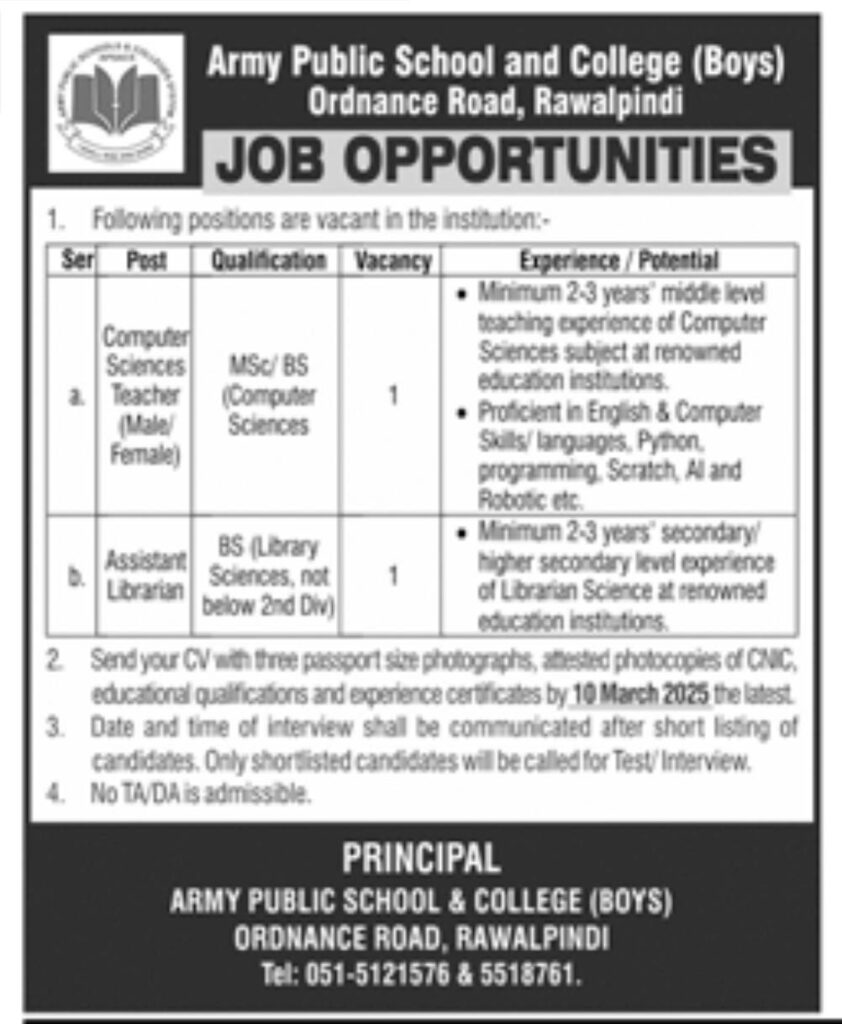 Army Public School and College (Boys) Rawalpindi Jobs 2026 announced for Computer Science Teacher and Assistant Librarian. Check qualifications, 2–3 years experience requirement, vacancy details, and last date 10 March 2026.