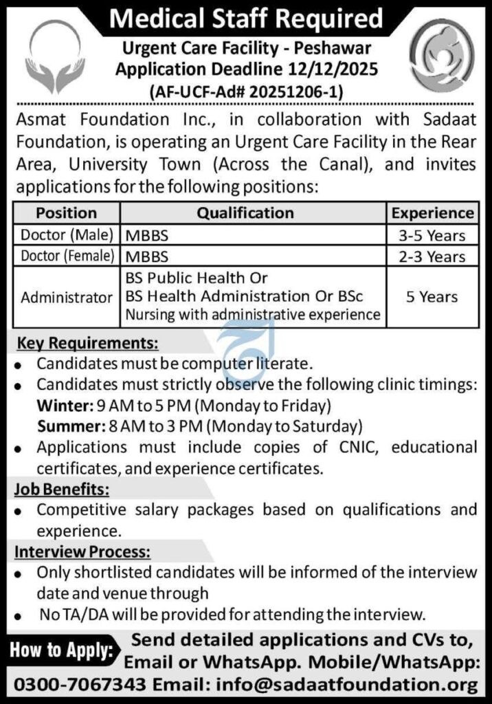 “Asmat Foundation is hiring Doctors (Male and Female) and an Administrator for their Urgent Care Facility in Peshawar. Apply by 12th December 2025 for these healthcare positions with competitive salary packages.”