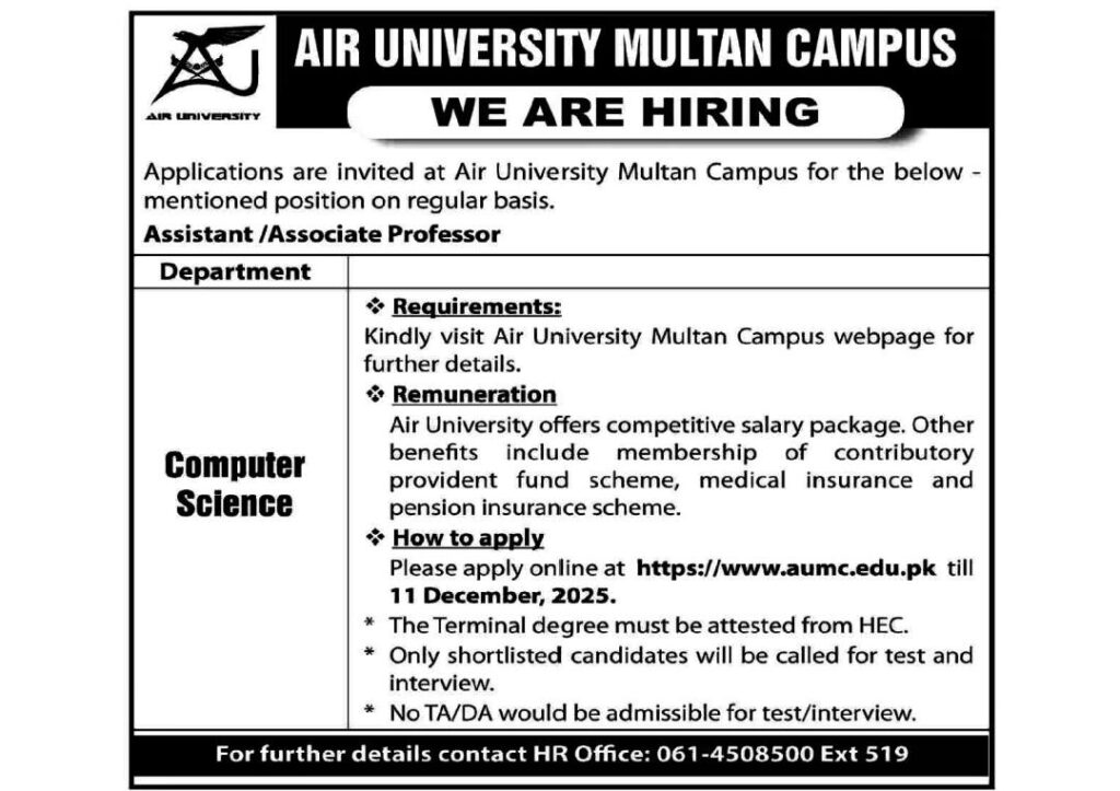 “Air University Multan Campus is hiring for the position of Assistant/Associate Professor in Computer Science. Competitive salary and benefits include medical and pension schemes. Apply by December 11, 2025.”