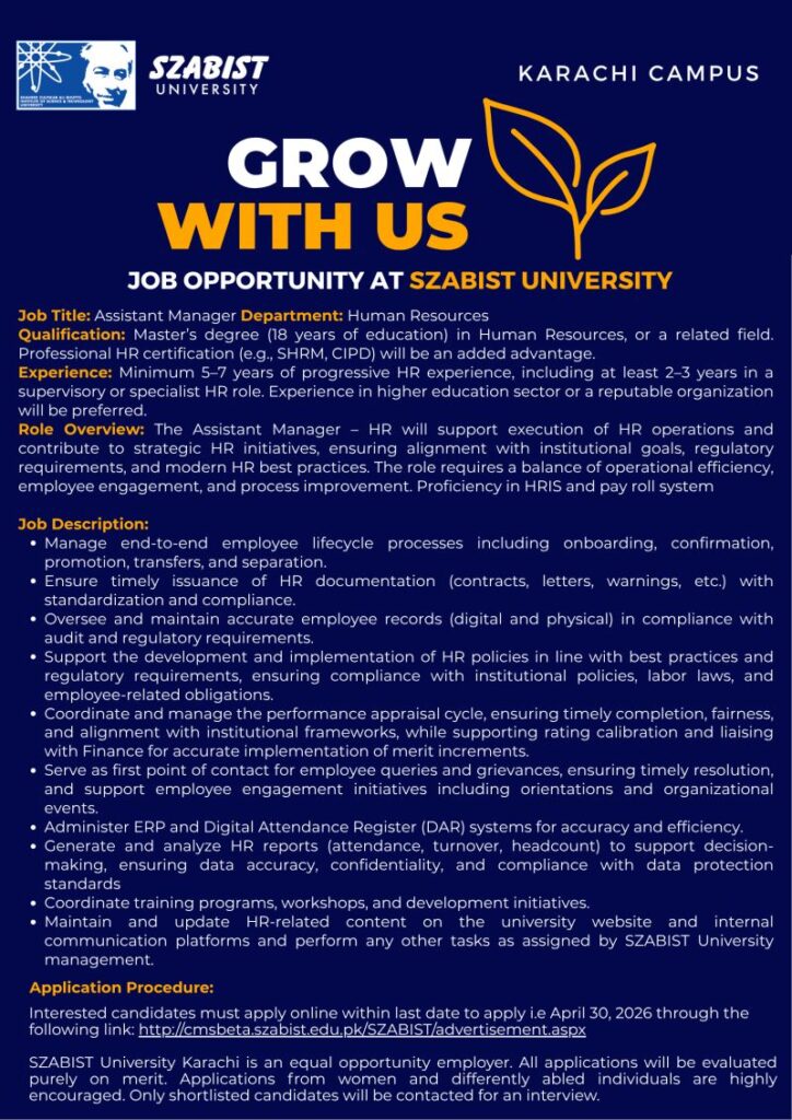 Apply for Assistant Manager HR job in Karachi 2026 at a leading university. Master’s in HR with 5–7 years experience required. Deadline April 30.