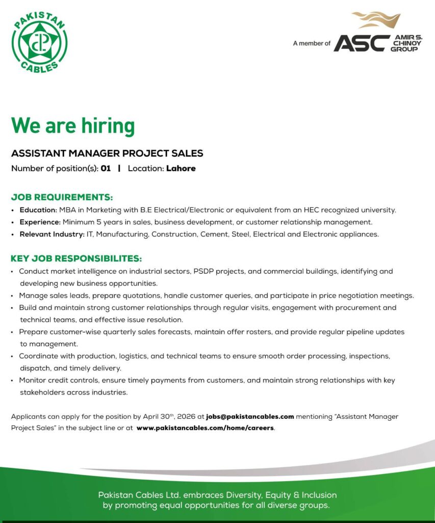 Apply for Assistant Manager Project Sales job at Pakistan Cables Lahore 2026. Check eligibility, qualifications, experience, responsibilities, and application deadline.