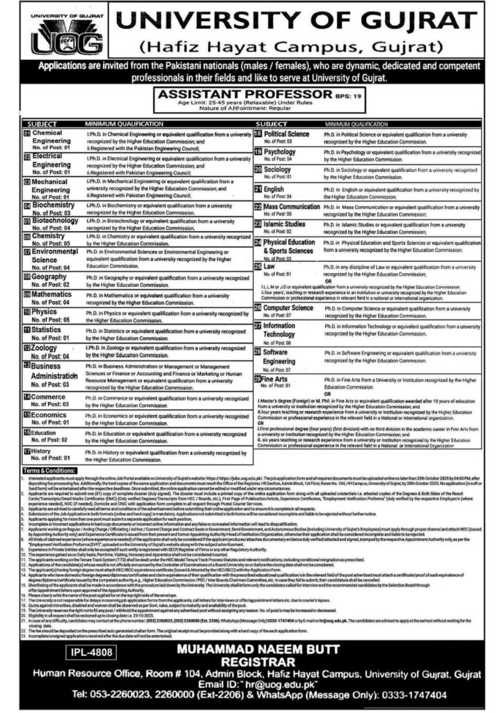 “Apply now for Assistant Professor positions at the University of Gujrat in various fields including Engineering, Science, Social Sciences, and more. Regular appointment with qualifications as per HEC guidelines. Apply by October 25, 2025.”