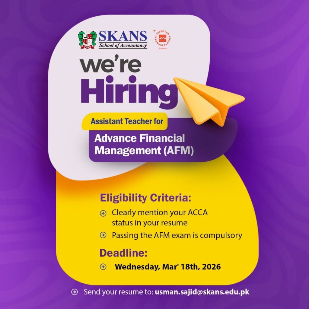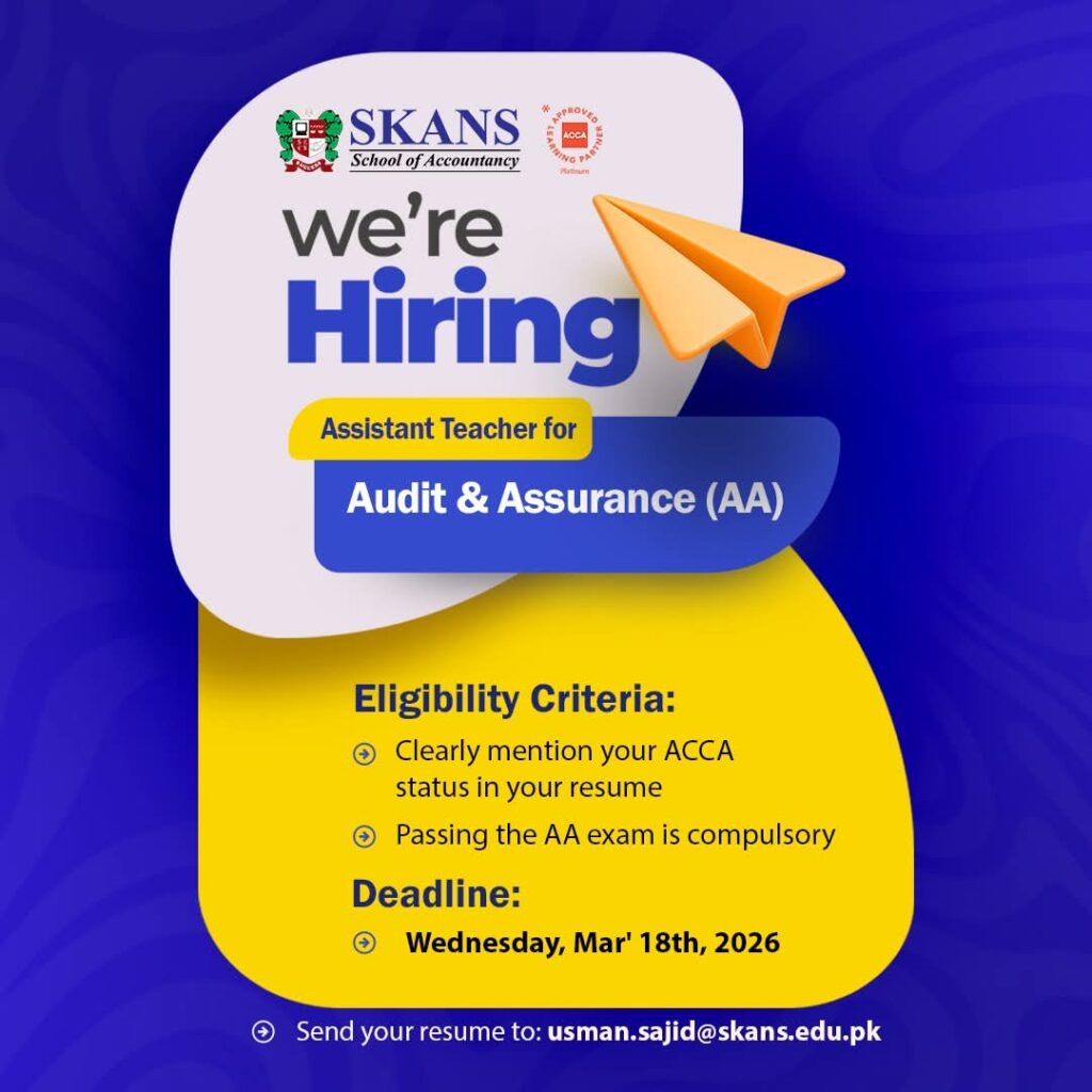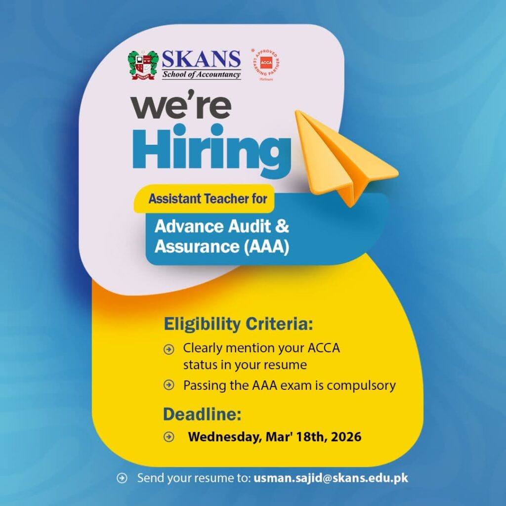 SKANS School of Accountancy is hiring Assistant Teachers for ACCA courses in Audit & Assurance (AAA), Financial Management (AFM), and Audit & Assurance (AA). Candidates must have passed the relevant ACCA exams. Apply by March 18, 2026.