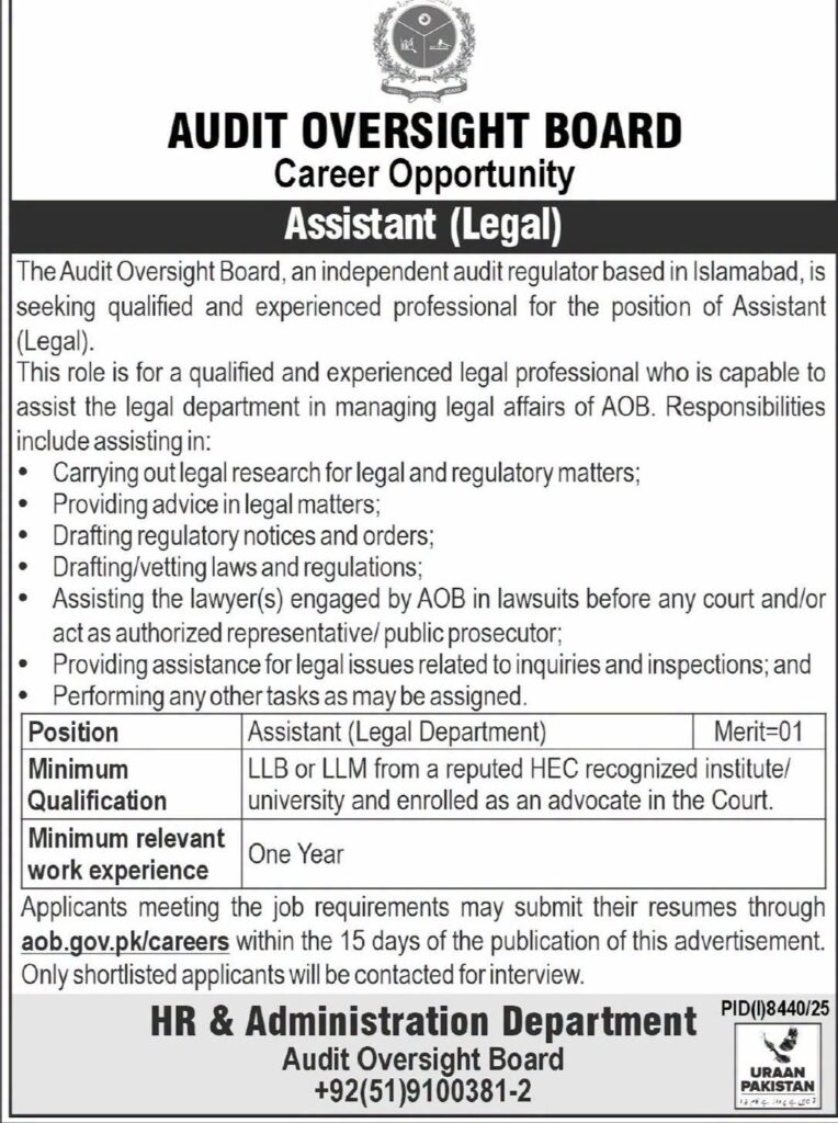 Apply for Audit Oversight Board jobs 2025 in Islamabad. Assistant (Legal) vacancy with LLB/LLM required, 1-year experience. Government legal job with simple application process and limited competition.