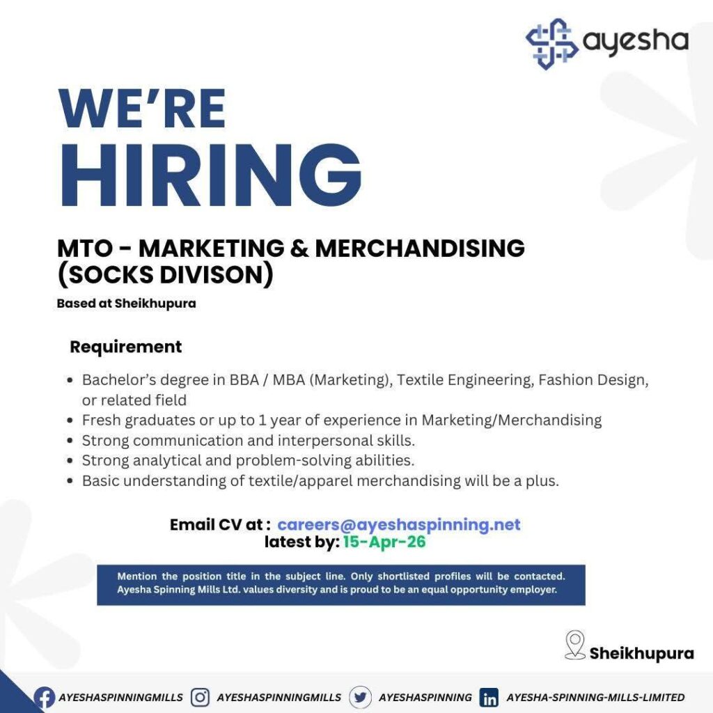 Apply for MTO Marketing & Merchandising Jobs 2026 at Ayesha Spinning Mills Sheikhupura. Fresh graduates eligible. Check qualifications, skills, and April 15 deadline.