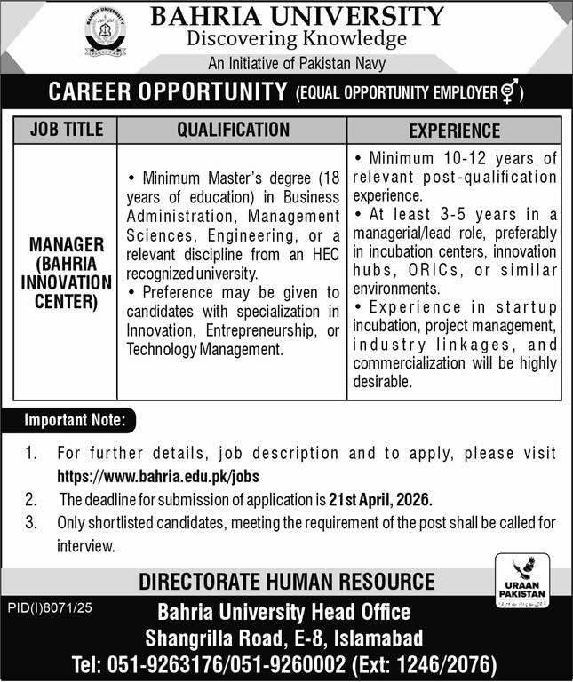 Apply for Bahria University Jobs 2026 in Islamabad for Manager Innovation Center. Check eligibility, qualifications, experience, and deadline for this low-competition government job.