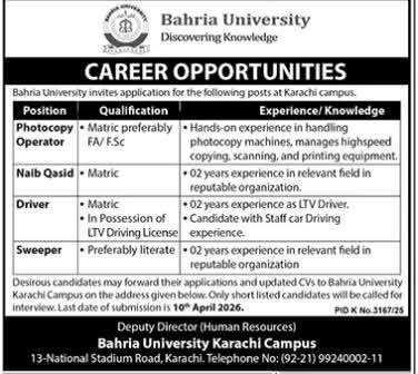 Apply for Bahria University Karachi Jobs 2026. Vacancies for Photocopy Operator, Naib Qasid, Driver, and Sweeper. Check qualifications, experience, and April deadline.