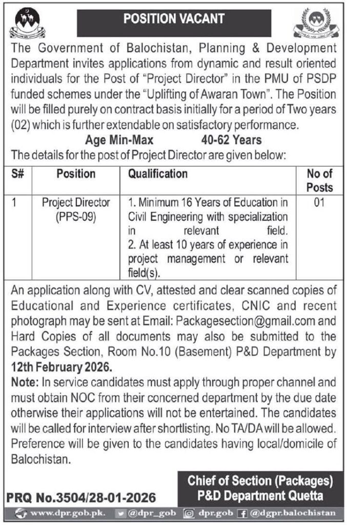 The Government of Balochistan invites applications for the position of Project Director under the Uplifting of Awaran Town. Learn about qualifications, experience requirements, and application process with a deadline of February 12, 2026.