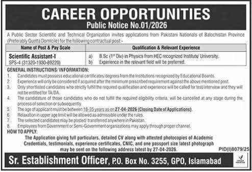 Apply for Balochistan Public Sector Organization Jobs 2026 for Scientific Assistant roles. Check qualifications, eligibility, deadline, and application process for latest low-competition government jobs in Pakistan.