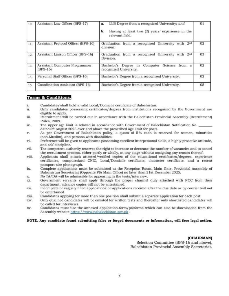 - How to Apply: Complete applications must be submitted to the Reception Room, Main Gate, Provincial Assembly of Balochistan (Opposite PIA Main Office) no later than 31st December 2025.