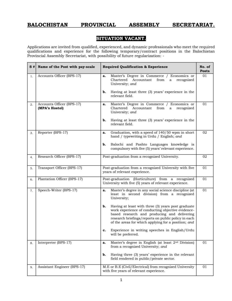 | 2 | Accounts Officer (BPS-17) (MPA’s Hostel) | – Master’s Degree in Commerce / Economics or Chartered Accountant – 3 years’ experience in the relevant field | 01 |