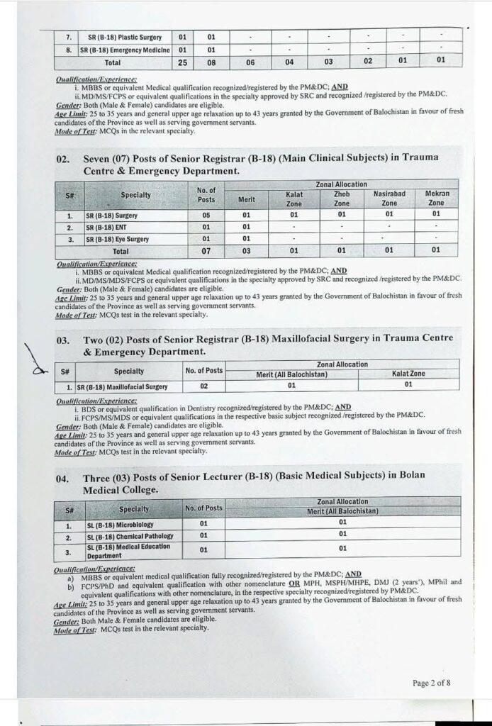 | Health Department | Senior Registrar (Clinical Sub-Specialties) | 18 | 25+ | MBBS + FCPS/MS/MD or equivalent |