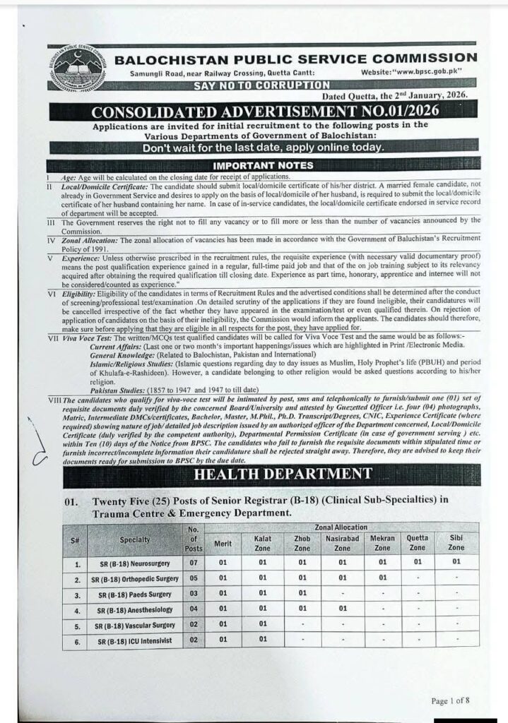 Balochistan Public Service Commission announces a large-scale recruitment drive 2026 for lecturer, assistant professor, senior registrar, planning officer, and technical posts. Hundreds of government vacancies across health, education, and technical departments. Apply online before February 9, 2026.