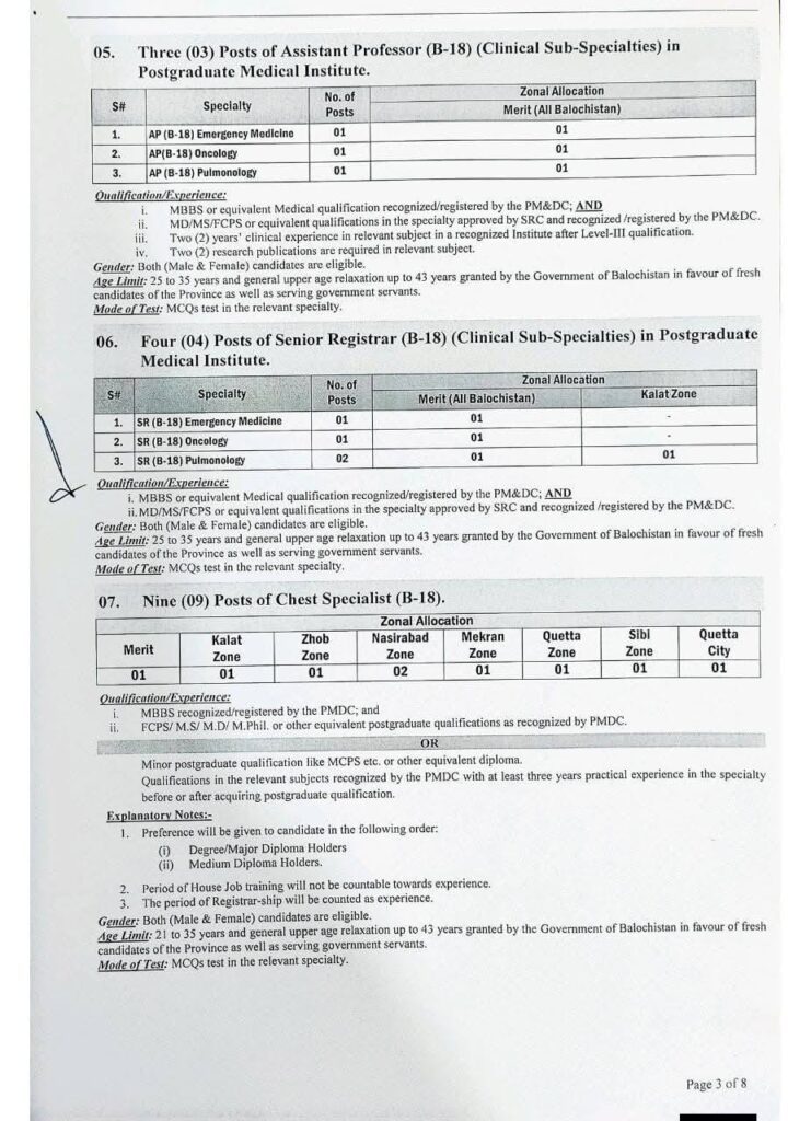 | Health Department | Assistant Professor (Clinical) | 18 | 03 | MBBS + FCPS/MS with experience |