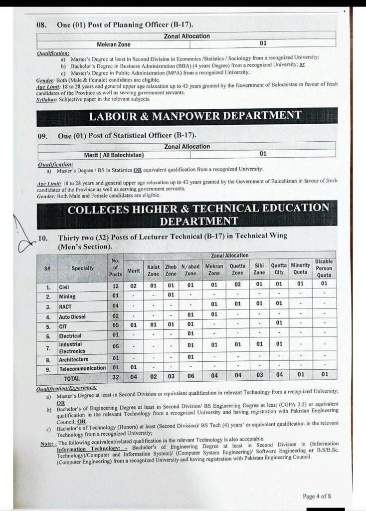 | Technical Education | Lecturer Technical (Engineering & Tech Fields) | 17 | 32 | BE / BS Engineering / PEC registered |