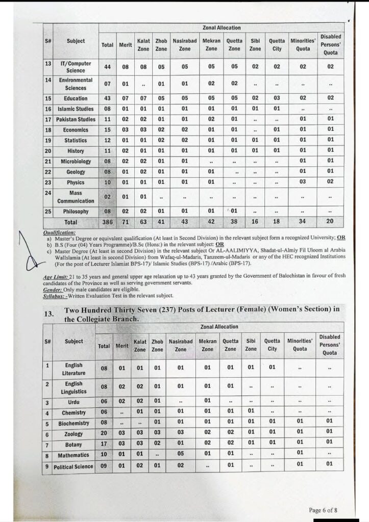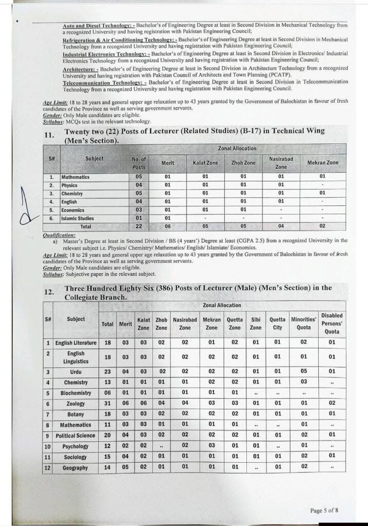 | Colleges Education | Lecturer (Male – Collegiate Branch) | 17 | 386 | Master’s / BS (Hons) in relevant subject |