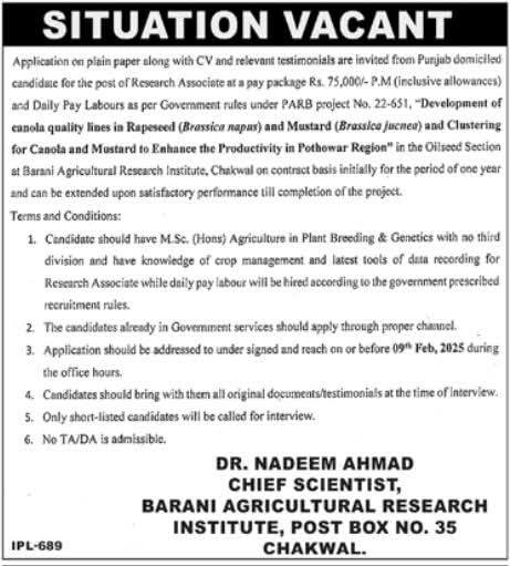 Apply for Research Associate position at Barani Agricultural Research Institute Chakwal in 2026. Latest vacancies for agricultural research in plant breeding and genetics with qualifications, experience, and application deadline details.