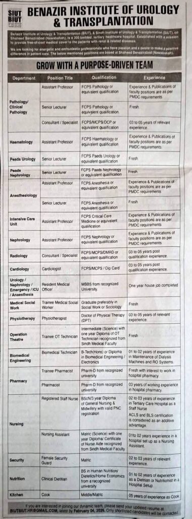 Benazir Institute of Urology & Transplantation (BIUT) is hiring for various medical and non-medical positions in departments such as Pathology, Radiology, Nursing, and more. Apply by 4th February 2026 for contract-based roles in a state-of-the-art healthcare facility in Shaheed Benazirabad.