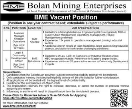 Bolan Mining Enterprises jobs 2026 for Assistant Manager Mining Operations and Legal Community Development roles. Check qualifications, experience requirements and application details.