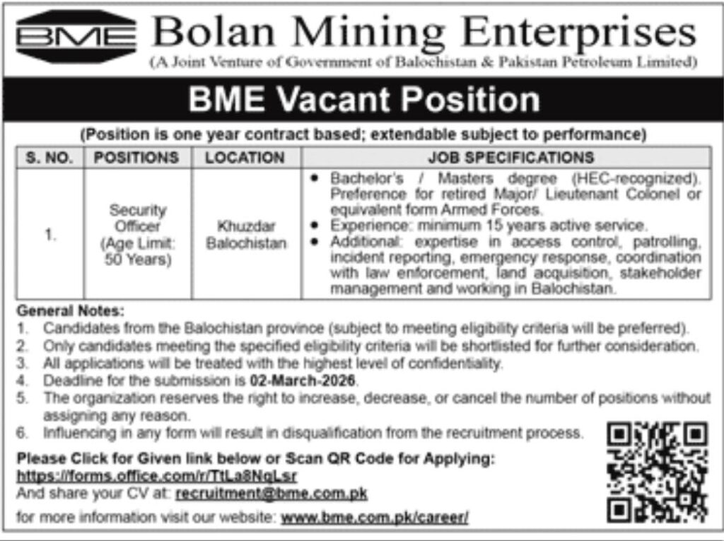 Bolan Mining Enterprises (BME) announces Security Officer job in Khuzdar Balochistan on contract basis. Check eligibility, qualification, 15 years experience requirement and apply before 02 March 2026.