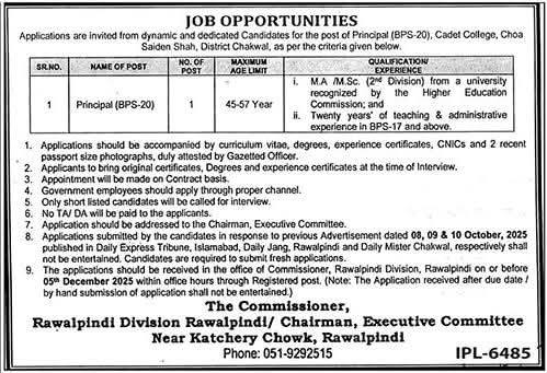 Commissioner Rawalpindi is hiring Principal (BPS-20) for Cadet College Chakwal. Requires M.A./M.Sc. and 20 years teaching/admin experience. Apply by Dec 05, 2025.