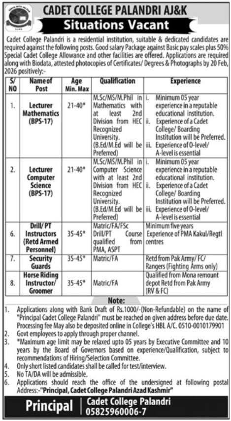 Apply for Cadet College Palandri AJK Jobs 2026 including Lecturer Mathematics, Lecturer Computer Science, Drill PT Instructor, Security Guard and Horse Riding Instructor. Check eligibility, age limit and deadline.