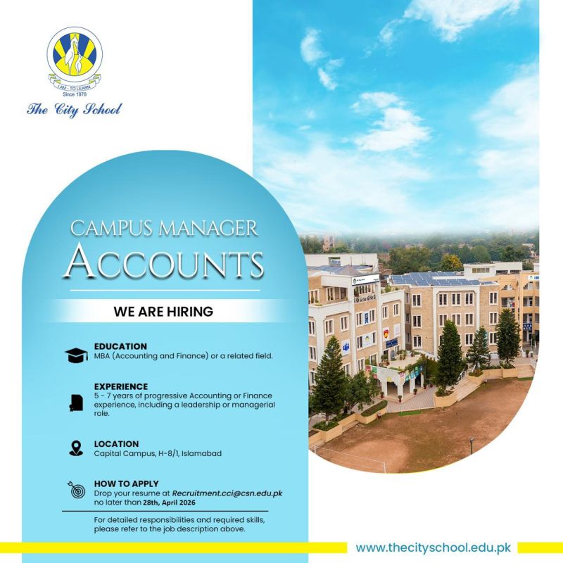 Apply for Campus Manager Accounts job in Islamabad 2026. MBA Finance required with 5–7 years accounting experience. Deadline April 28. Leadership role in school administration.
