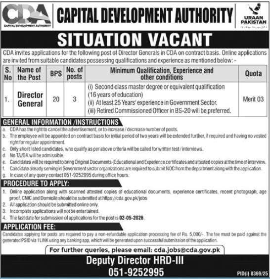 Apply for CDA Director General Jobs 2026 in Islamabad. Check eligibility, experience, quota, application fee, deadline, and process for low-competition senior government positions.